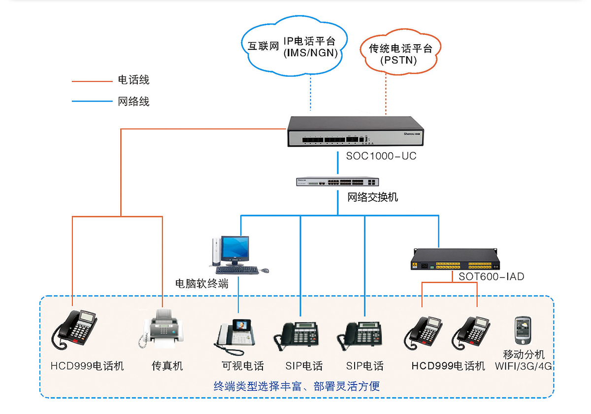 實(shí)現(xiàn)模擬話機(jī)、IP話機(jī)、IP視頻話機(jī)、電腦軟客戶端、手機(jī)客戶端、IAD等多終端接入。無論是在辦公室、會(huì)議室、出差途中、家中,還是在客戶現(xiàn)場,隨時(shí)隨地都能進(jìn)行溝通,讓溝通"無處不在"。