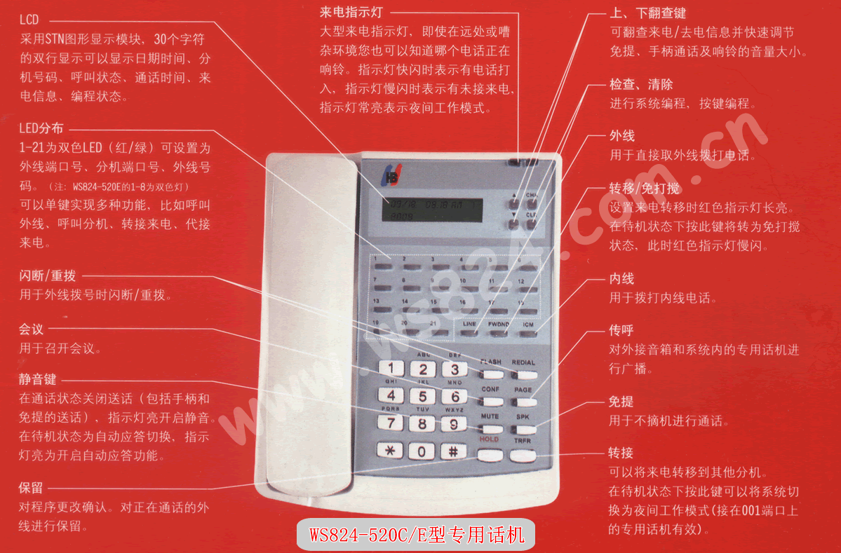 WS824國威專用話機(jī)主要應(yīng)用于現(xiàn)代企業(yè)辦公前臺(tái)話務(wù)員專用話機(jī)和經(jīng)理秘書專用話機(jī);國威是國內(nèi)最早研制生產(chǎn)出數(shù)字專用話機(jī)的廠家;經(jīng)多年技術(shù)和功能的改進(jìn),大多型號(hào)的專用話機(jī)屏幕并可中文顯示,更適用與國人使用習(xí)慣,用戶可放心購買和稱心的使用。