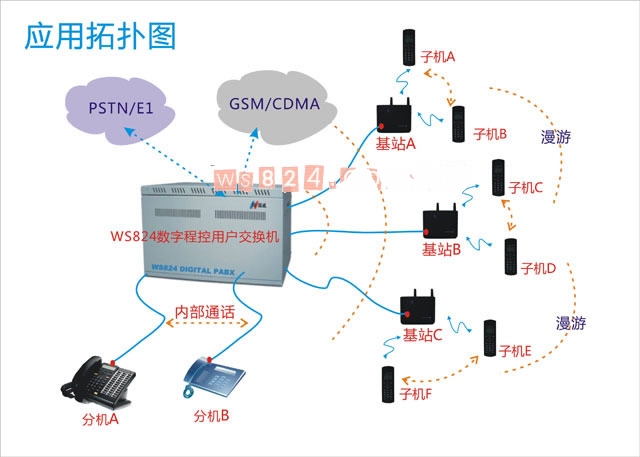 2.4G無線交換機(jī)系統(tǒng)最多可接8個(gè)基站,共注冊(cè)255部子機(jī), 功能如下: (1).分機(jī)漫游功能: 無線分機(jī)可以在覆蓋區(qū)域內(nèi)的任意地方漫游,可以接聽和呼叫電話. (2).分機(jī)同振功能: 當(dāng)給某個(gè)桌面固定分機(jī)電話配備一個(gè)2.4G分機(jī)后,有電話呼入時(shí),固定分機(jī)與2.4G分機(jī)將同時(shí)響鈴,任意一個(gè)接聽,另一個(gè)將自動(dòng)停止響鈴; (3).固定分機(jī)優(yōu)先功能: 當(dāng)2.4G分機(jī)在漫游通話過程中,回到固定分機(jī)位置,拿起分機(jī)就可以把2.4G分機(jī)的電話自動(dòng)切換回固定分機(jī),使固定分機(jī)使用優(yōu)先; (4).隨身攜帶功能: 子機(jī)的卡扣配件,支持使用者把子機(jī)卡在身上某個(gè)部分,如腰間,衣物的口袋上. [相關(guān)下載]